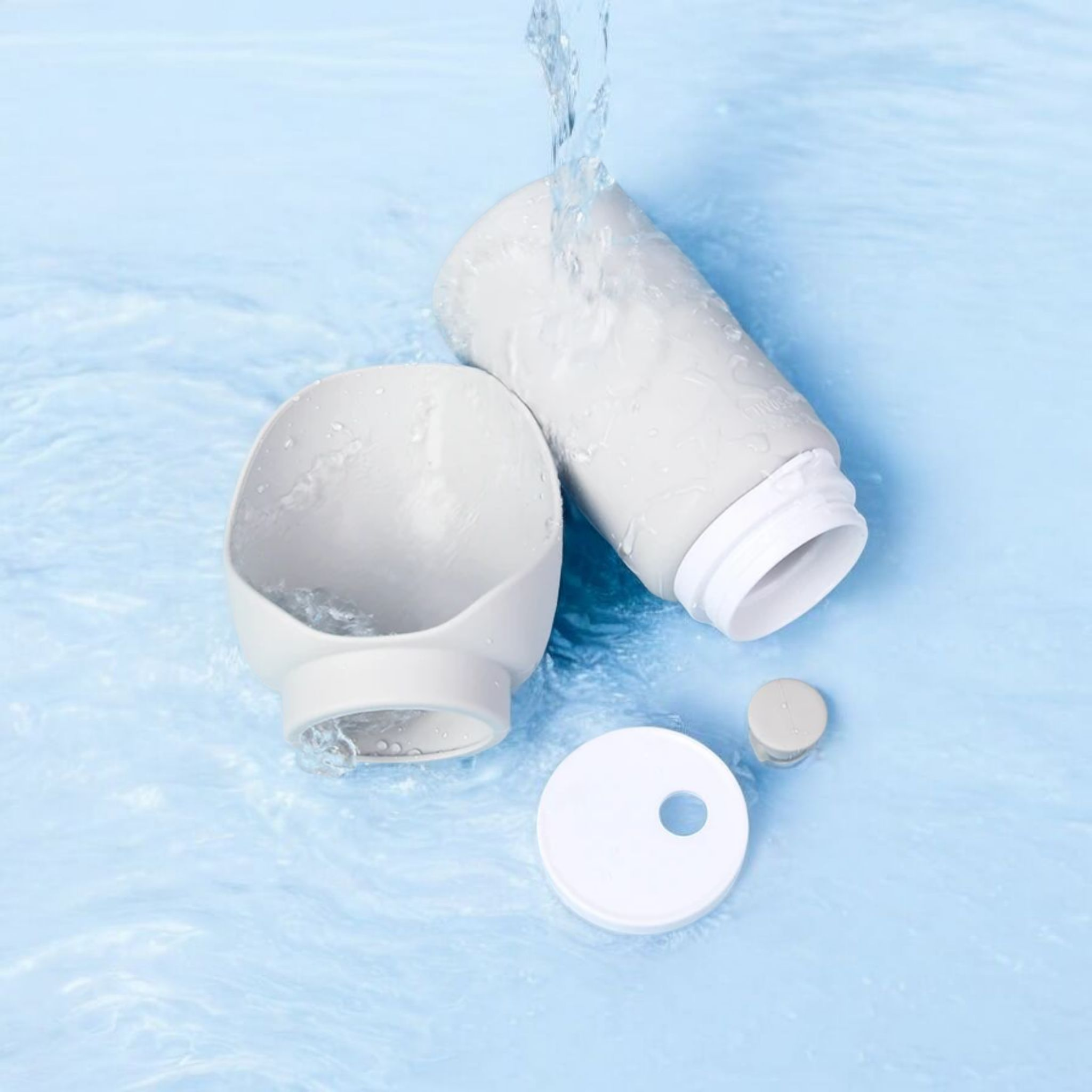 Górna część butelki pełni funkcję składanej miseczki, dzięki czemu nie trzeba nosić dodatkowego naczynia.